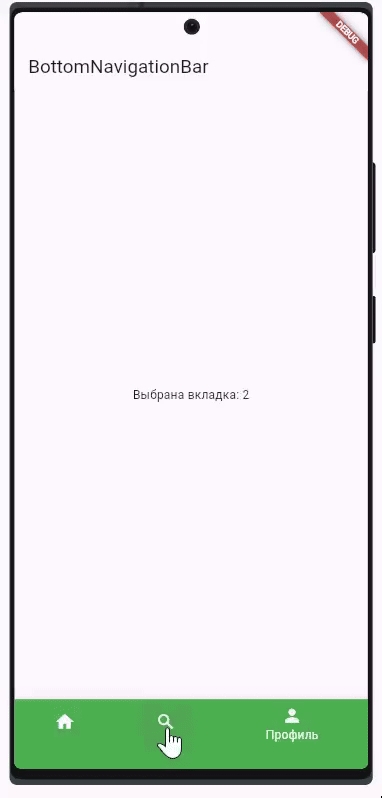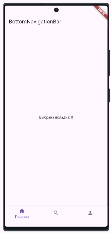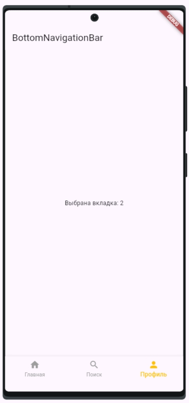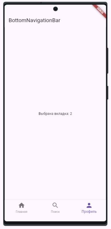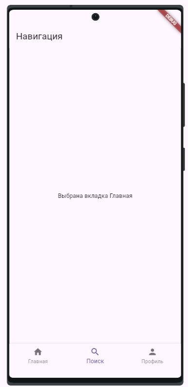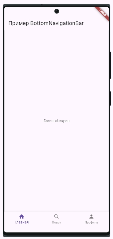 Здесь BottomNavigationBar содержит три вкладки: "Главная", "Поиск", "Профиль". Каждая вкладка имеет иконку и текстовое описание.